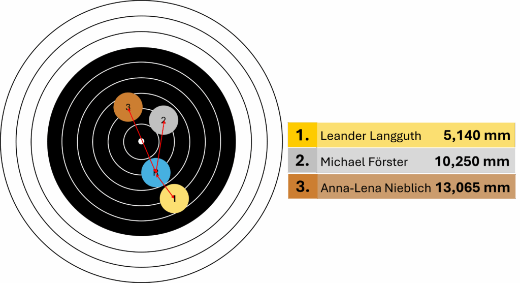 | Pokalsieger 2024 1. Leander Langguth (8,9 R – Abstand 5,14mm) Mitte KK-SV 1903 Förtschendorf Referenzschuss vom Ehrenmitglied Hans Michel: 527,9 T |